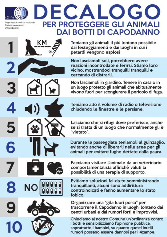 Gli ultimi giorni dell’anno sono interessati da una grande apprensione per i danni che faranno i botti di Capodanno, causando feriti e vittime tra uomini e animali. Anche quest’anno l’OIPA (Organizzazione Internazionale Protezione Animali) ha iniziato la diffusione del decalogo con le indicazioni per affrontare al meglio il problema, dando utili e pratici consigli per proteggere i propri amici a 4 zampe, come non lasciarli in giardino e tenere alto il volume della televisione per attutire i rumori provenienti dall’esterno (decalogo e articolo di approfondimento disponibili sul sito https://www.oipa.org/italia/botti-di-capodanno/) .