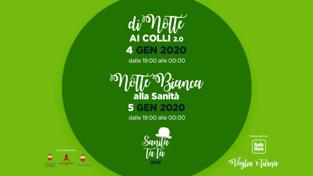 Sabato 4 gennaio verrà recuperato invece l’appuntamento con la kermesse Di notte ai Colli 2.0., un evento organizzato all’interno del più ampio programma natalizio Voglia ‘e turnà del Comune di Napoli con il patrocinio della Terza Municipalità di Napoli, Fondazione di Comunità San Gennaro, Colli Aminei 3.0 Centro Commerciale ed Aperipark. Tra i partner di questa edizione Radio Marte che, con Gianni Simioli, Rosanna Iannacone, Franco Simeri, Marco Critelli, Enzo D’Aniello, Mary Boccia accompagnerà l’intera manifestazione.